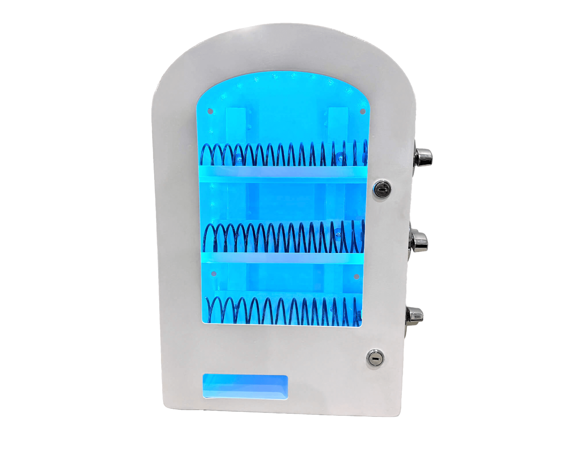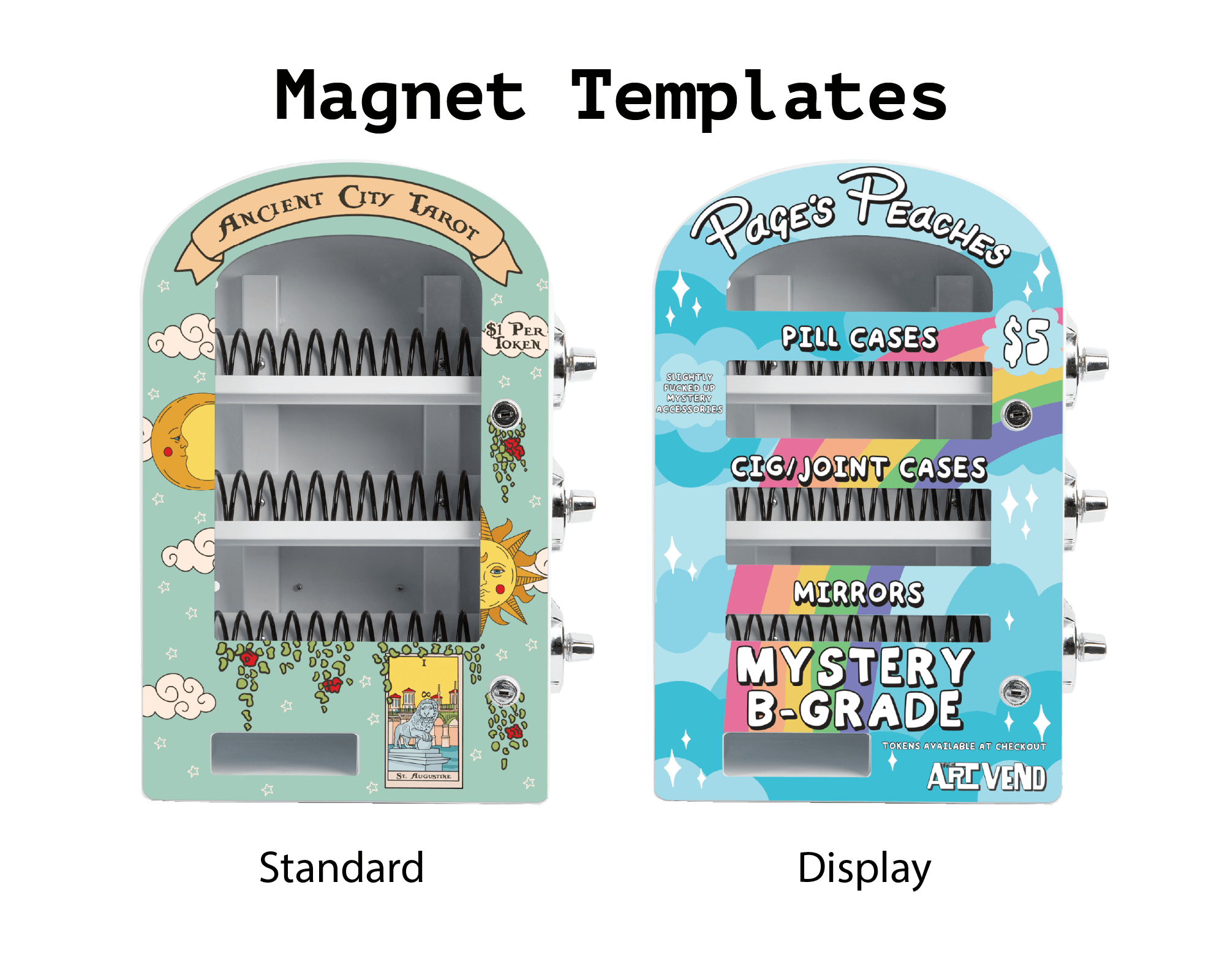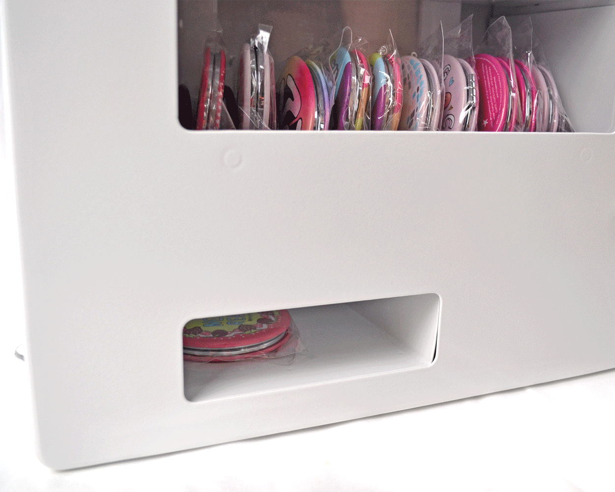 A manual (non-electric), token-operated, and tabletop vending machine for artists and retail spaces. It is a modern take on classic vending machines, designed to give you full control over what is sold! Tokens let you determine the price and different sized coils allow for a variety of products from stickers, enamel pins, jewelry, keychains, and so much more.