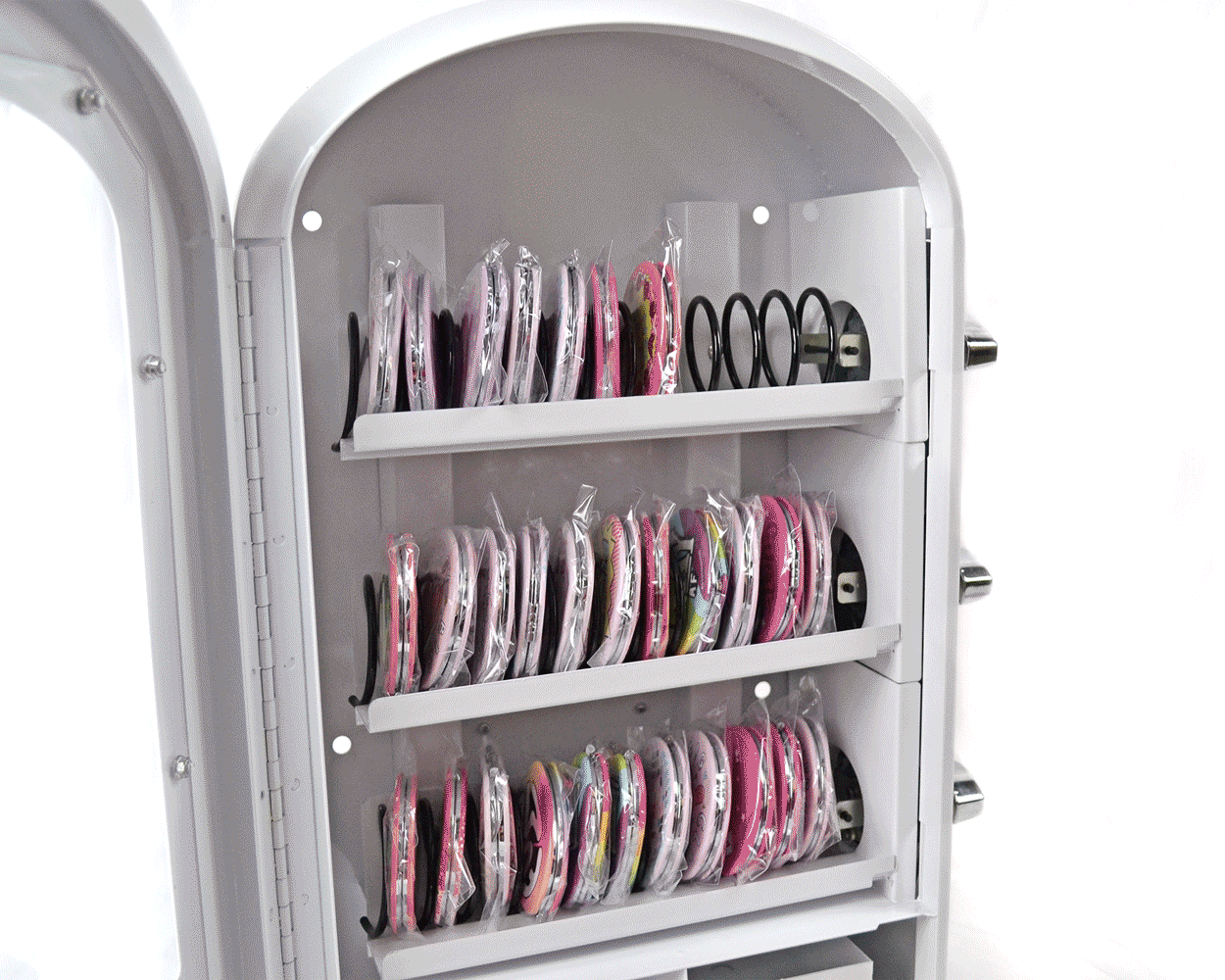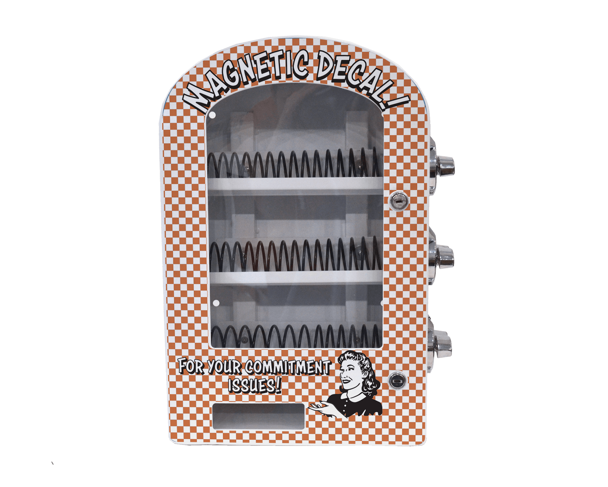 Fill the machine with your products (what fits? stickers, mini art prints, enamel pins, jewelry, keychains, pill cases, compact mirrors, cigarette cases and more). Then close and lock the door.