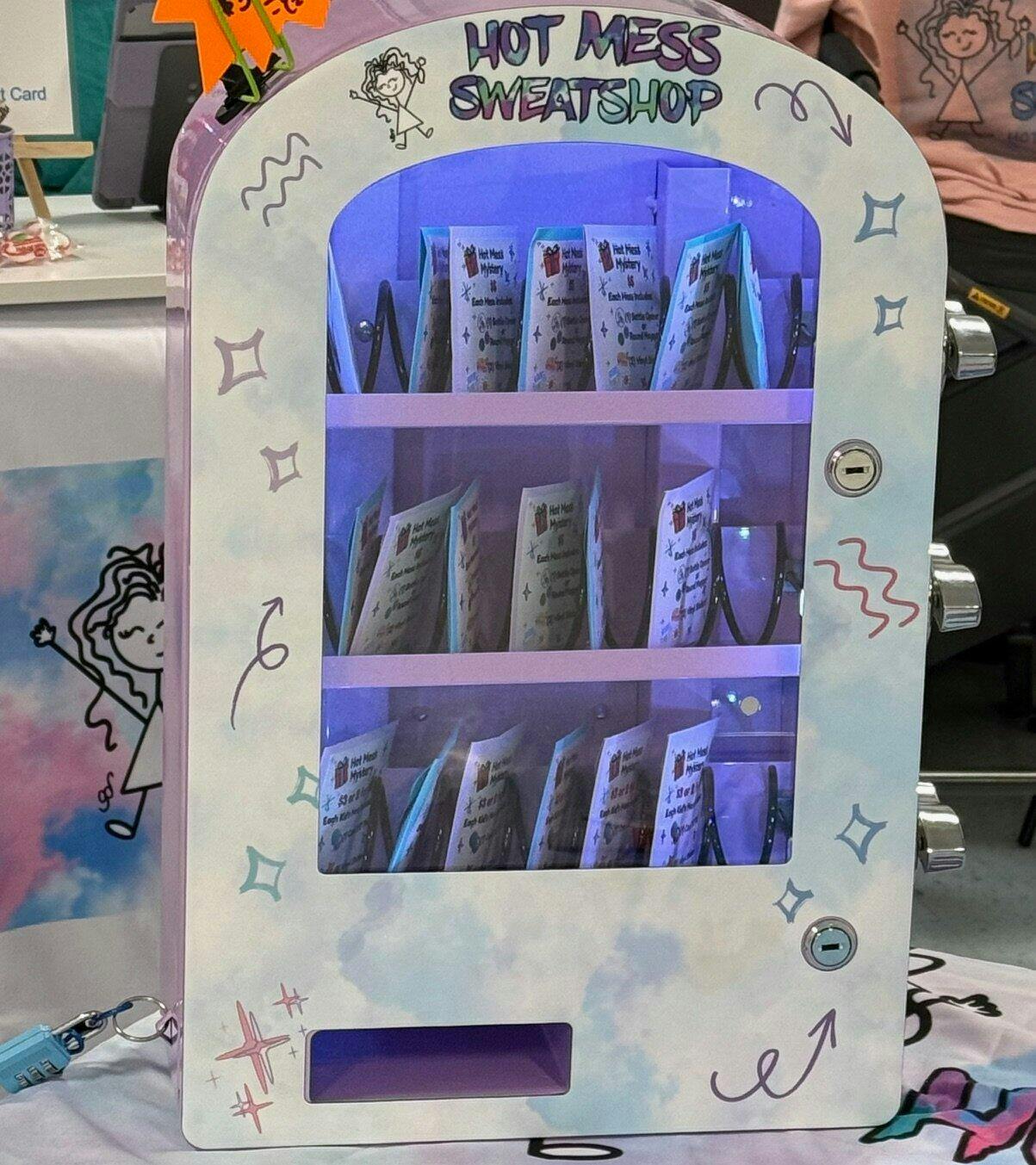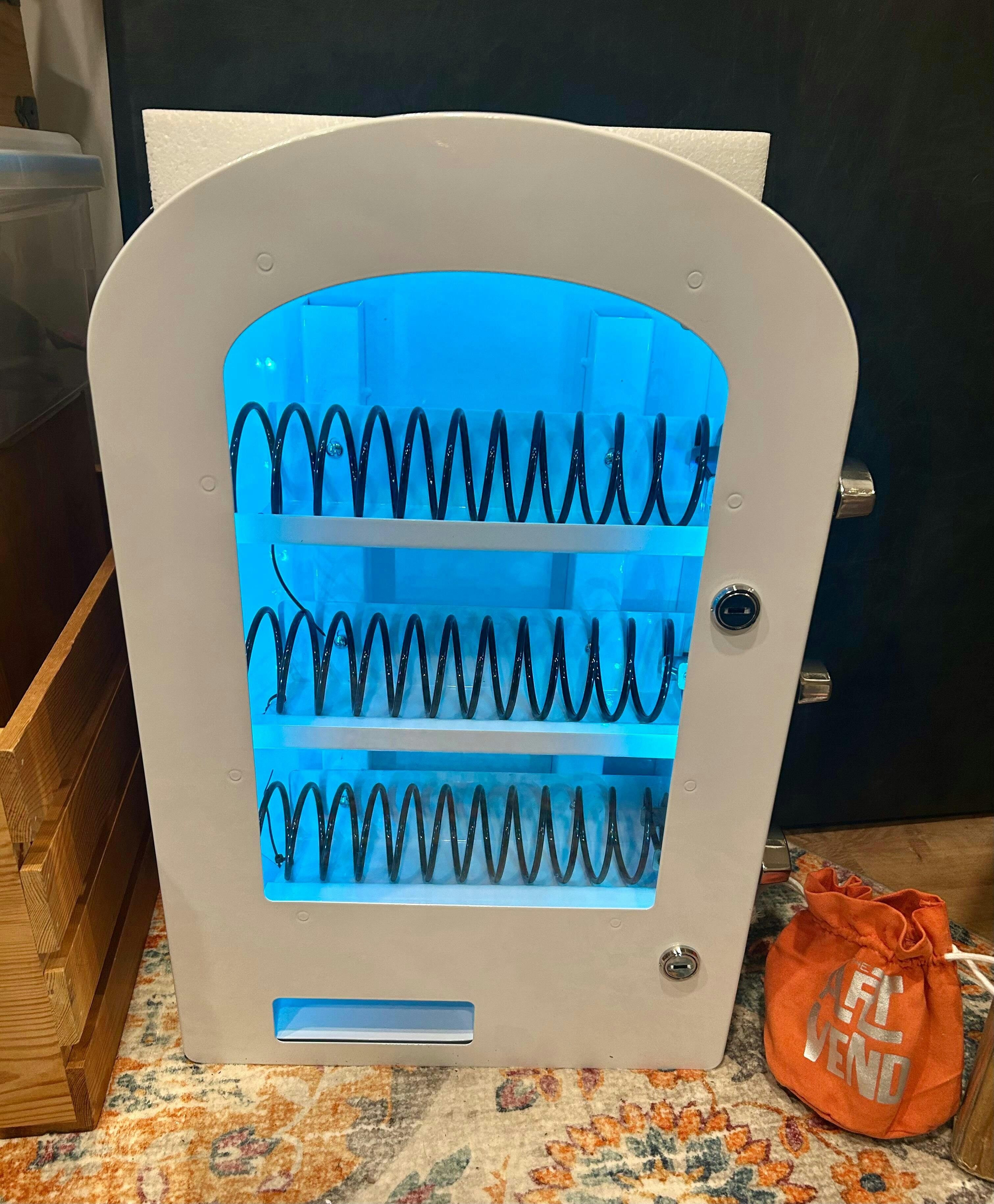 A manual (non-electric), token-operated, and tabletop vending machine for artists and retail spaces. It is a modern take on classic vending machines, designed to give you full control over what is sold! Tokens let you determine the price and different sized coils allow for a variety of products from stickers, enamel pins, jewelry, keychains, and so much more.